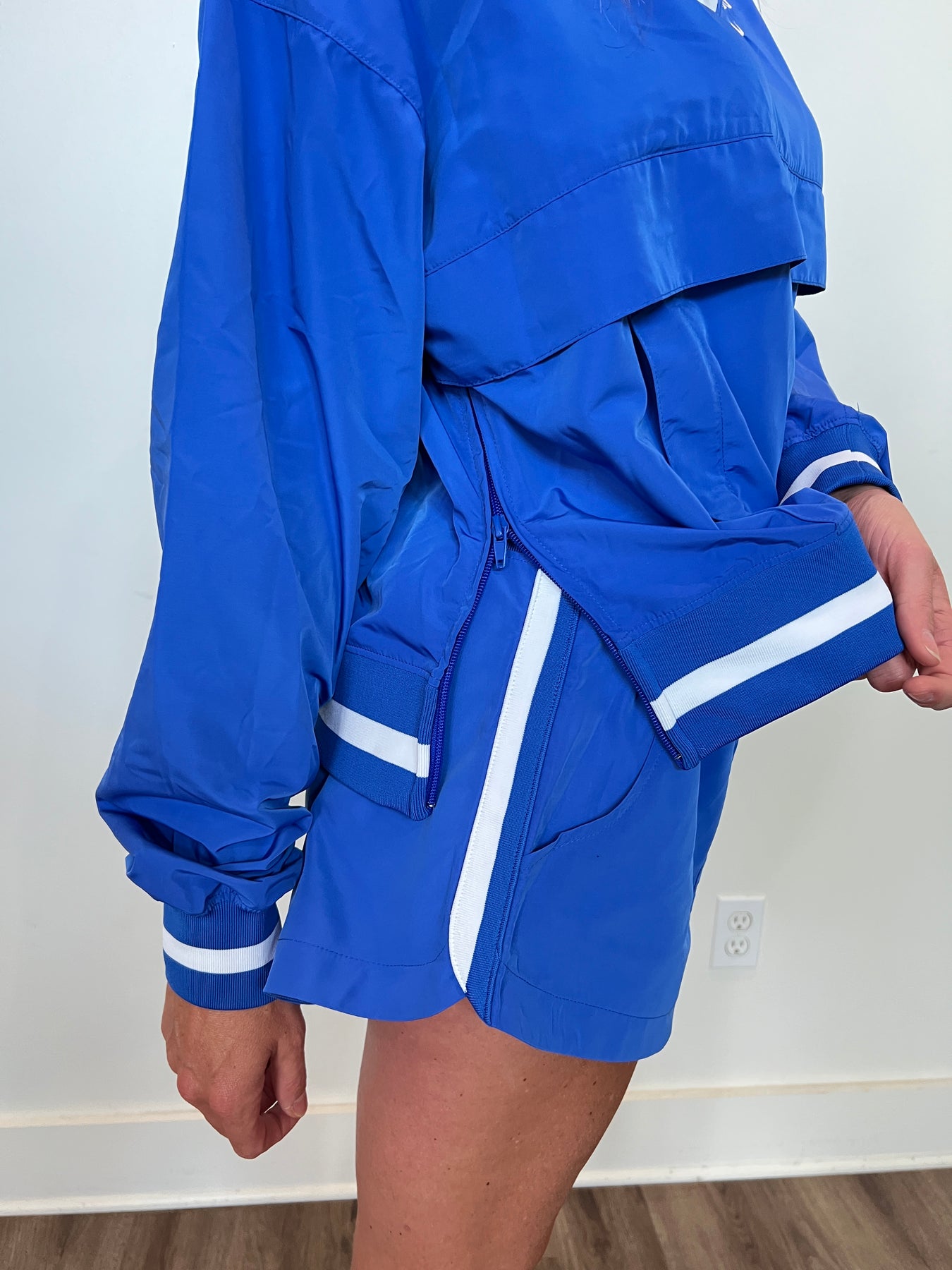 This windbreaker top features a V-neck, long sleeves, and contrast rib tape for extra detail. It also includes convenient zipped pockets.