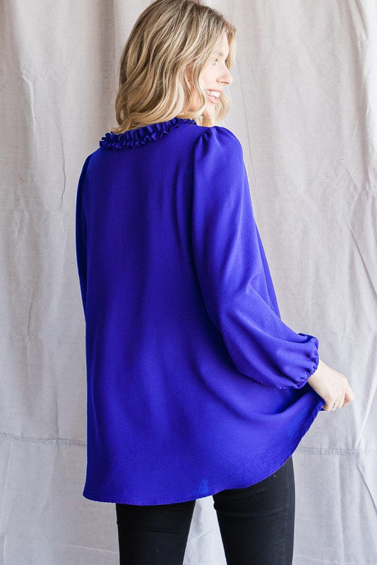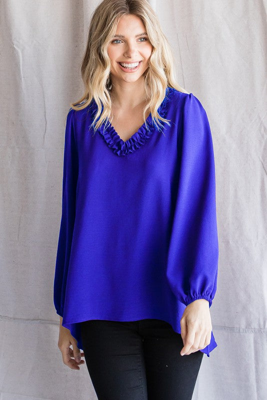 Solid top with a frill ruffle V-neckline and long bubble sleeves.