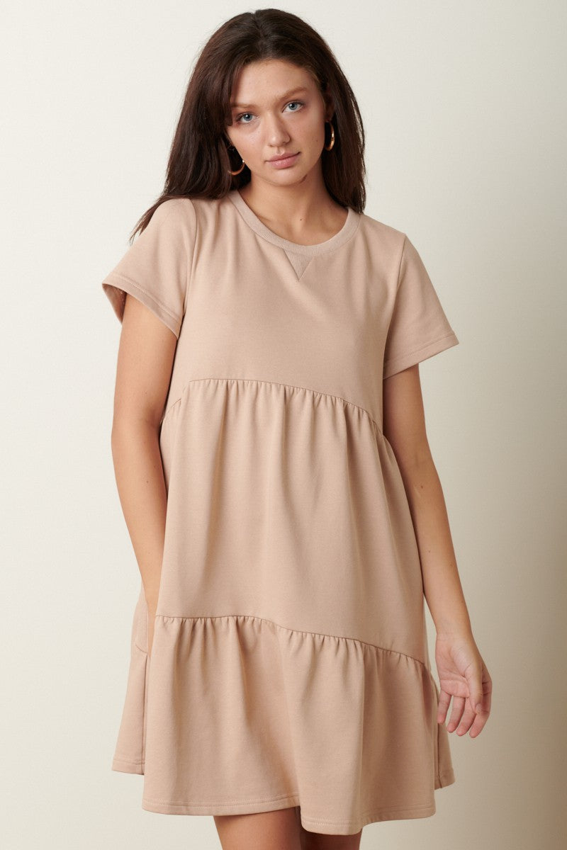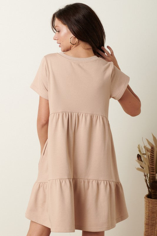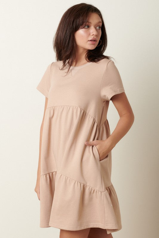 FRENCH TERRY KNIT FABRIC DRESS, ROUND NECK, SHORT SLEEVE, BABYDOLL WAISTLINE, SIDE POCKETS.