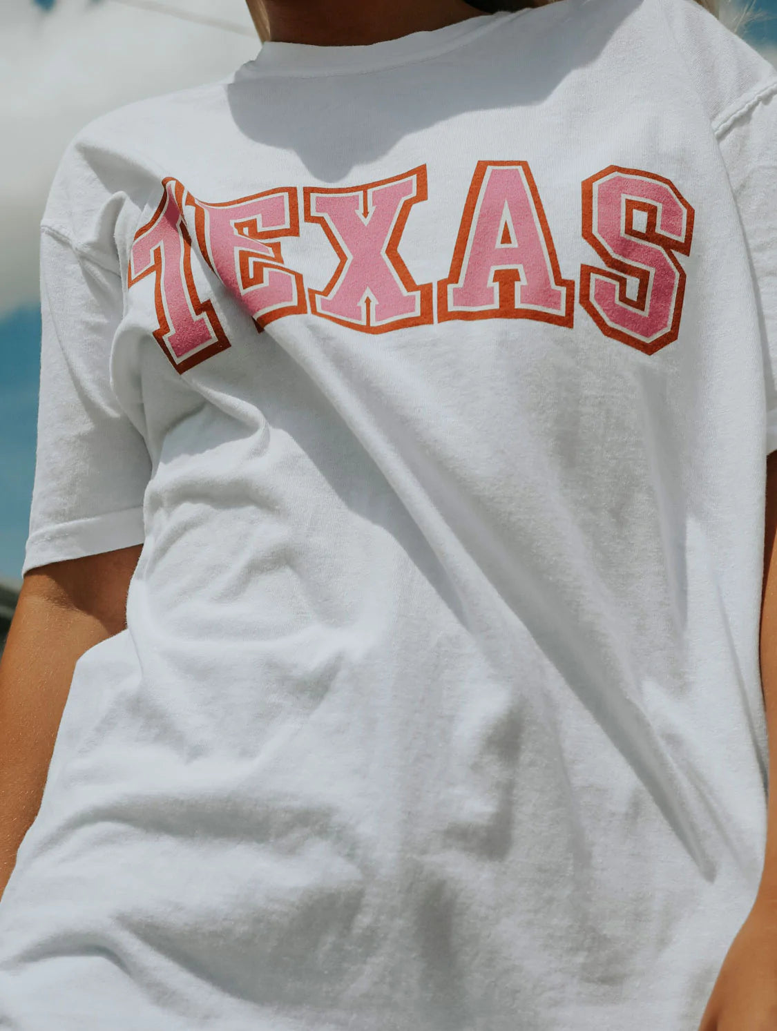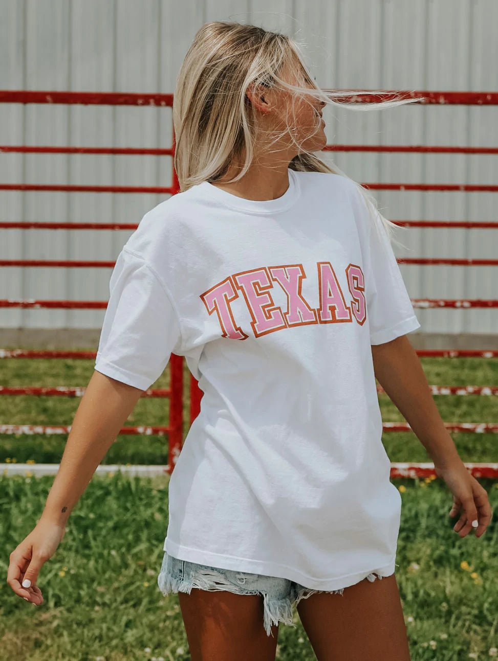 your new favorite summer tee! this tee goes with everything and makes your tan pop! this piece features a collegiate font with bubblegum pink and maude colors representing it on a white oversized tee!
