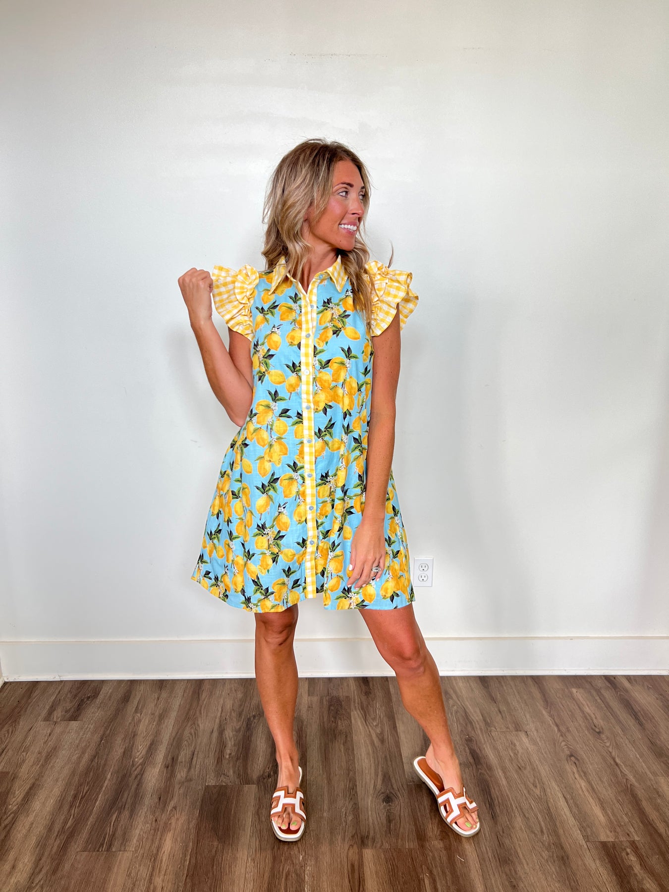 - LEMON PRINT WOVEN FABRIC- GINGHAM CHECK RUFFLE SLEEVE- BUTTON DOWN- MINI LENGTH- SIDE POCKET